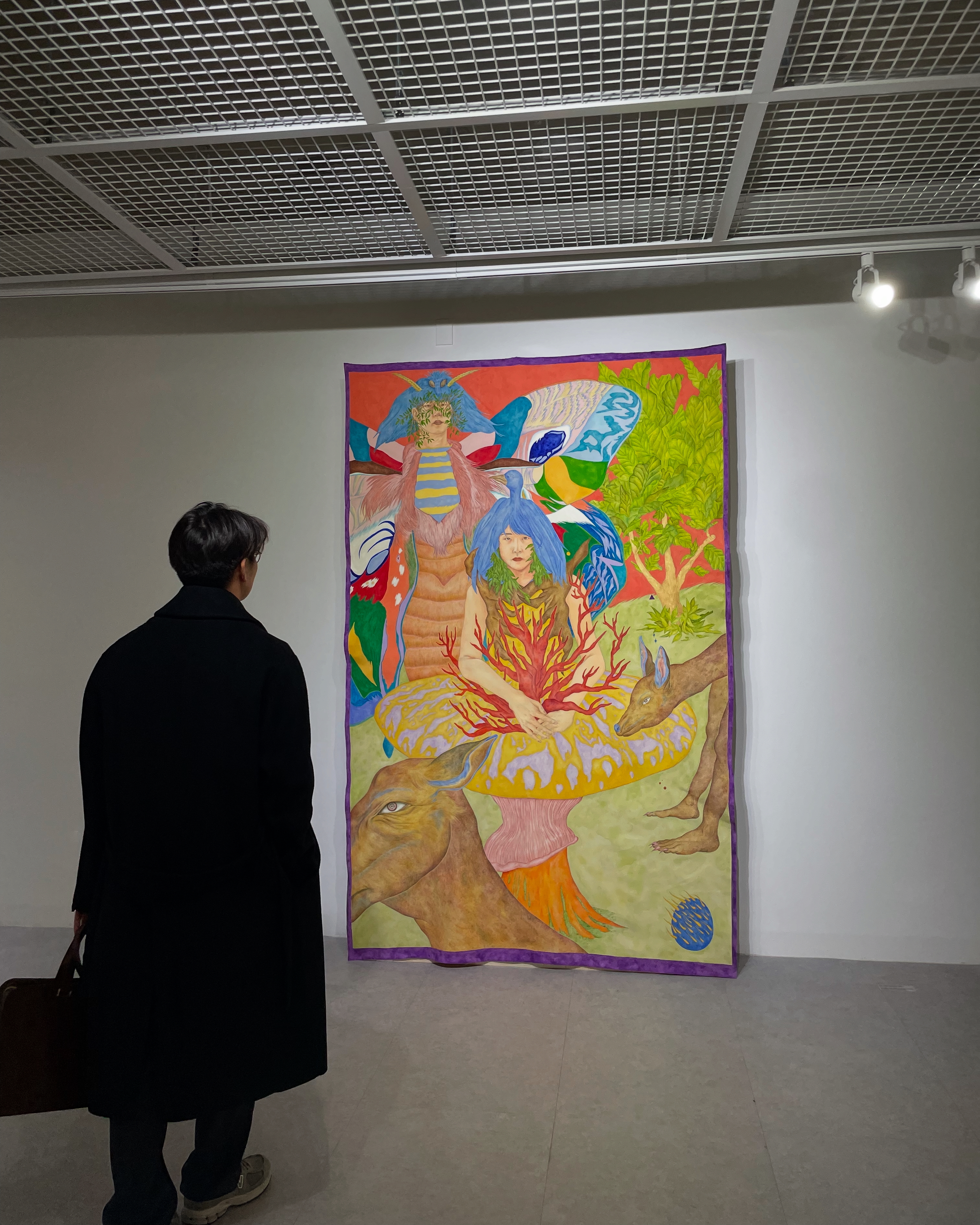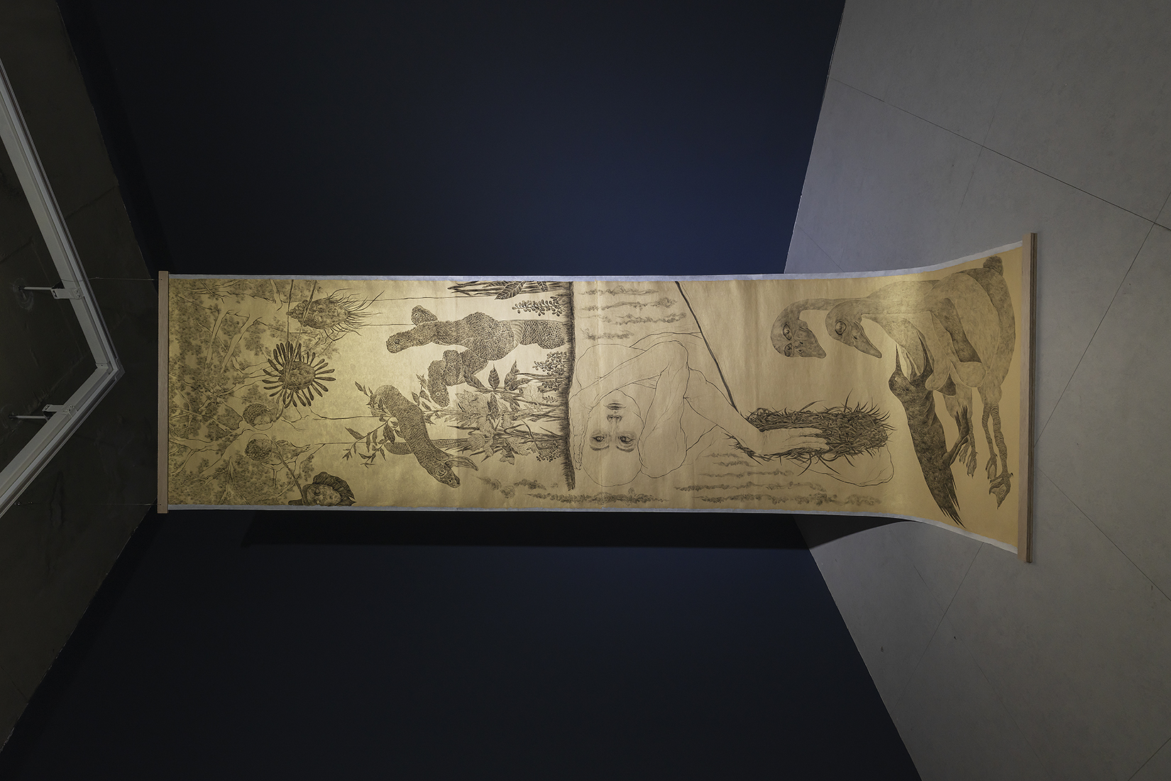 1층 오른쪽 전시장 한쪽에 크게 호(arc)를 그리며 천장에 걸려있는 <빛과 겹의 풍경>(2024)은 김도연이 뉴질랜드를 여행했을 때 캠핑카 안에서 창밖의 풍경을 그린 드로잉이다. 싱가포르 식물원, 뉴질랜드 궁전 등 작가가 실제 방문했던 장소와 관찰했던 대상에 관한 기억을 소환하여 다양한 배경에 여러생명체가 혼종된 인물을 등장시킨 장면이 연속으로 이어진다. 이야기의 시작과 끝을 알 수 없는 거대한 풍경 앞에서, 우리는 실제 가보지 않았더라도 저 세계를 얼마든지 상상할 수 있다.