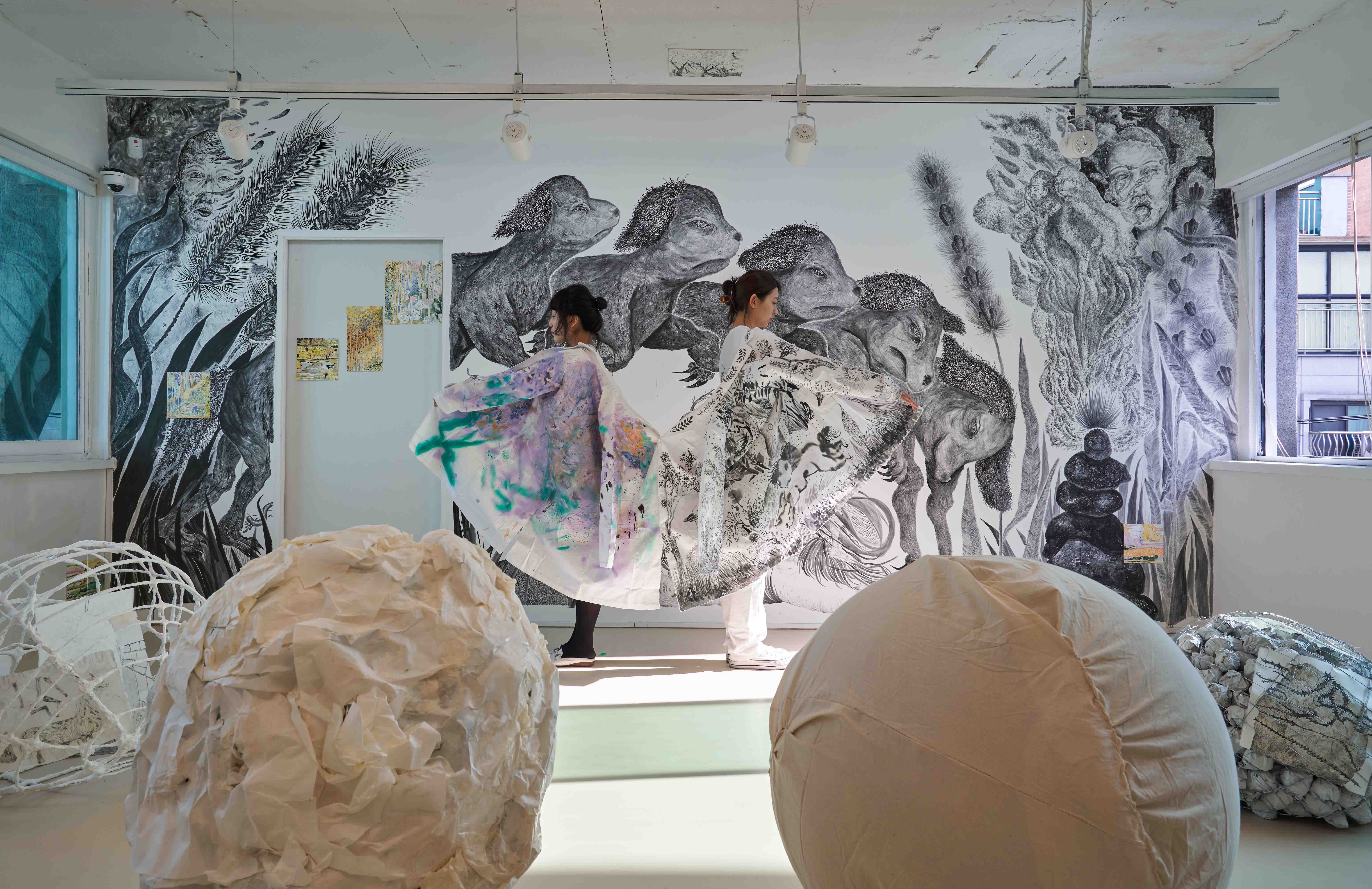 참여작가 김도연, 박시오리 작가는 도심 속 공간에서 드로잉-선(線)으로서 수행의 시간들을 만들고, 결과적으로 비워져 있는 공간을 만단(萬端)으로 채워가며 전시를 완성지어간다.
