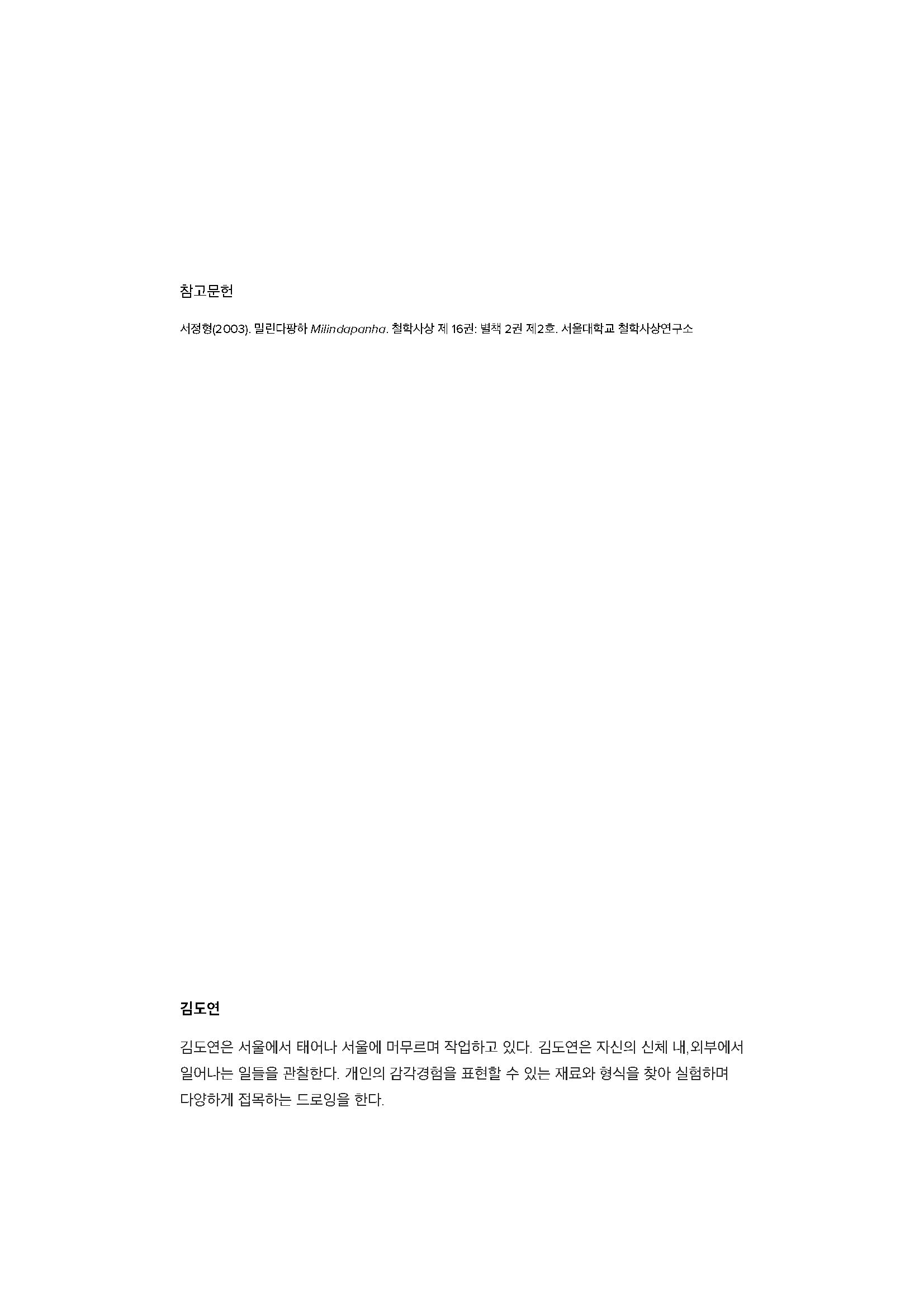 나의 몸을 스쳐지나가고 감싸고 스며들었던 풀과의 접촉을 다시 떠올려보자. 풀로 인해 서서히 흘러갔던 나의 현상들을 세밀하게 되짚어보자. 그것은 정확히 어떠했는가. 얼마나 간지러웠고, 얼마나 보드라웠으며, 얼마나 날카로웠고, 얼마나 나를 조여냈는가. 그리고 나는 그 풀을 어떻 게 떨쳐내려고 몸부림을 쳤는지, 어떻게 고함을 외쳤는지, 어떻게 죽여나갔는지 관찰을 해보자. 풀을 낳았던 돌멩이는 등잔이고, 등잔의 불은 풀이라는 비유의 옷을 입혀보자. 불꽃은 어떤 변 화를 가졌던 것일지 다시 바라보고 받아들여보자. ...(김도연 작업 에세이 중 발췌)